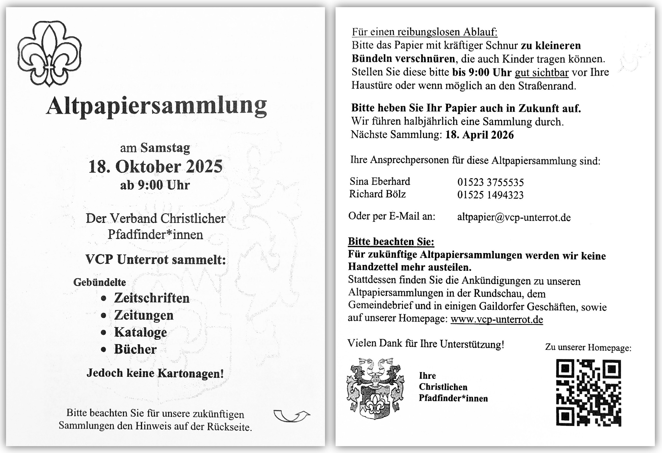 Es wird das letzte Mal sein, dass Altpapier-Zettel in den Briefkästen zu finden sind. Zukünftig entnehmt bitte der Zeitung und den Aushängen die Altpapier-Sammlungstermine.